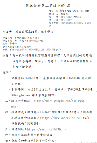 國立臺南第二高級中學辦理「元宇宙與AIoT的跨領域應用專題線上講座」「元宇宙與-AIoT-的跨領域應用專題講座」實施計畫下載 瀏覽次數: 7Post author:hlvs203Post published:2025-12-17Post category:研習活動Read more articles上一篇文章普通型高級中等學校英語文學科中心114學年數位故事(Digital Storytelling)線上講座下一篇文章轉知-新太空・新課綱:高中教育落地與教材共創論壇相關內容國立中央大學辦理2023「K-12天文教育論壇」,鼓勵教師報名參加。2023-09-13高中資訊科技學科中心辦理「110學年度教師增能研習【108課綱推動三年之回顧與展望】活動」,鼓勵資訊教師報名參加。2022-05-06
