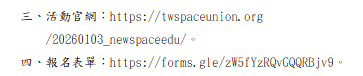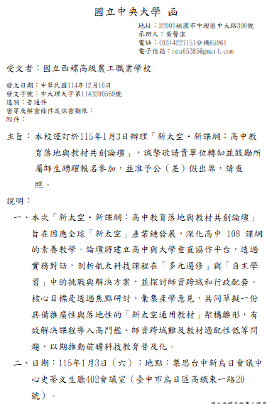 轉知-新太空・新課綱:高中教育落地與教材共創論壇 瀏覽次數: 6Post author:hlvs203Post published:2025-12-17Post category:研習活動Read more articles上一篇文章國立臺南第二高級中學辦理「元宇宙與AIoT的跨領域應用專題線上講座」下一篇文章轉知-教師增能講座「生物研究法-課程規劃與執行」相關內容雲林縣政府辦理111學年度「數位輔助自主學習教師增能研習」,邀請教師踴躍參與。2022-11-07國立清華大學辦理112學年度「十二年國民基本教育原住民族文化科學模組製作研習班」活動,鼓勵教師踴躍報名參加。2023-09-07