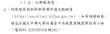 轉知-115年度教育部國民及學前教育署推動高級中等學校創新教學工作創新教學獎評選實施計畫創新教學團體獎評選實施計畫下載 瀏覽次數: 7Post author:hlvs203Post published:2025-12-17Post category:教職員公告Read more articles上一篇文章轉知-「客家委員會補助全國公務人員、教育人員及軍警人員參加客語能力認證報名費作業要點」規定,並自114年12月4日生效一案。相關內容國立虎尾科技大學教育部促進產學連結合作育才平臺-執行辦公室辦理四場「新農業領域-教師實務增能研習課程」,歡迎教師踴躍參加2023-06-17客家委員會辦理「113年度客語能力認證」-基礎級暨初級全國認證報名事宜, 請同仁踴躍報名。2024-04-24