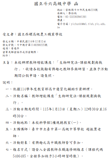 轉知-教師增能講座「生物研究法-課程規劃與執行」 瀏覽次數: 6Post author:hlvs203Post published:2025-12-17Post category:研習活動Read more articles上一篇文章轉知-新太空・新課綱:高中教育落地與教材共創論壇下一篇文章轉知-「生成式AI於通訊網路的應用」工作坊相關內容「普通型高級中等學校英語文學科中心111學年高中英文教室裡的口說教學工作坊」實施計畫,請本校英文教師踴躍參加。2023-02-18雲林縣私立正心高級中學適性學習社區教育資源均質化實施方案-「木工實作-木托盤」工作坊活動2025-04-15