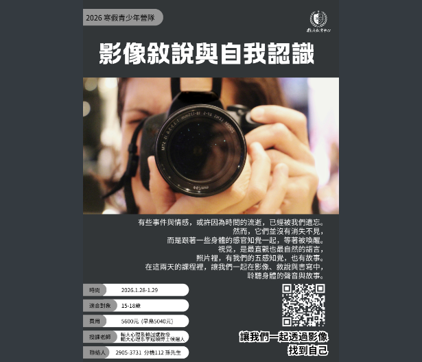 【轉知】輔仁大學學校財團法人輔仁大學推廣教育中心2026寒假青少年工作坊《影像敘說與自我認識》資訊輔仁大學學校財團法人輔仁大學-函-1下載 瀏覽次數: 1Post author:hlvs302aPost published:2025-12-17Post category:學生訊息Read more articles上一篇文章公告115國立西螺農工科技校院繁星計畫聯合推薦甄選入學學生薦選辦法下一篇文章【轉知】函轉美國在台協會(AIT)「2026科技女孩計畫」活動訊息相關內容國立屏東大學辦理勞動部「111年產業新尖兵試辦計畫」課程,「先進機械手臂機電整合與CNC工具機機械加工人才培訓班」、「物聯網之RFID模組應用與產品開發訓練班」及「智慧物聯網產業應用人才培訓班」歡迎踴躍參加2022-05-27國立陽明交通大學推廣教育中心辦理「心智圖超記憶親子免費講座」2024-04-30