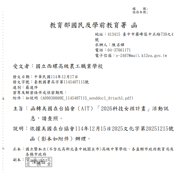 【轉知】函轉美國在台協會(AIT)「2026科技女孩計畫」活動訊息美國在台協會文化新聞組-函下載 瀏覽次數: 1Post author:hlvs302aPost published:2025-12-17Post category:學生訊息Read more articles上一篇文章【轉知】輔仁大學學校財團法人輔仁大學推廣教育中心2026寒假青少年工作坊《影像敘說與自我認識》資訊下一篇文章【轉知】國立屏東大學教育學系辦理「2026年【育夢同行】高中生科系探索營隊」相關內容國立故宮博物院112年度下半年「故宮X龍山寺遊藝思─學子嗨FUN參訪北部院區,鼓勵師生報名參加。2023-07-21112學年度第1學期第2次段考考試科目時間表-未排考試時段,請授課教師到教室隨班督導。請留意紅色字體為更改科目2023-11-19