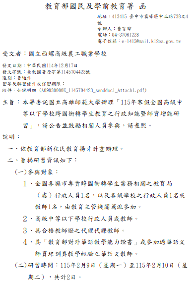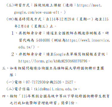轉知-115年寒假全國高級中等以下學校跨國銜轉學生教育之行政知能暨師資增能研習115-年寒假全國高級中等以下學校跨國銜轉學生教育之行政知能暨師資增能研習下載 瀏覽次數: 14Post author:hlvs203Post published:2025-12-18Post category:研習活動Read more articles上一篇文章轉知-「生成式AI×教學創新:線上桌遊課程設計」研習相關內容歷史學科中心暨台灣民間真相與和解促進會聯合辦理「看檔案如何說話」工作坊,勵歷史科教師踴躍報名參加2022-07-11國立臺灣師範大學修推廣學院辦理「111年度夏季推廣教育非學分班」招生訊息,請本校師生及同仁踴躍報名參加。2022-06-06