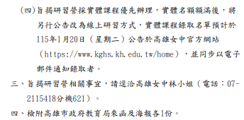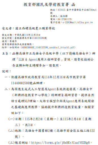 轉知-高雄女中辦理「LLM & Agent應用工程研習營」報名網址:https://forms.gle/jHxHErJCuafVEZHg8 瀏覽次數: 7Post author:hlvs203Post published:2025-12-21Post category:學生訊息 / 研習活動Read more articles上一篇文章教育部檢送更新之「25歲以下年輕成人照顧者就業服務資源地圖」1份,歡迎多加利用下一篇文章轉知-亞東科技大學辦理「生成式AI創新應用與跨域教學實作工作坊」相關內容國立中央大學列 45》—— 「人類與環境交互作用中的地理空間人工智慧」2025-02-20臺北科技大學進修部推廣教育中心辦理「民航局CAA無人機國家證照考照班第一期」課程2025-05-07