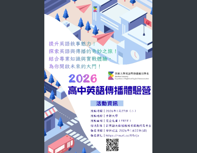 【轉知】世新大學英語暨傳播應用學系辦理「2026高中英語傳播體驗營」簡章及活動海報世新大學-函下載世新大學英語暨傳播應用學系2026-高中英語傳播體驗營下載 瀏覽次數: 7Post author:hlvs302aPost published:2025-12-22Post category:學生訊息Read more articles上一篇文章【轉知】逢甲大學運輸與物流學系謹訂於115年1月27日辦理「What isT&L? 運輸與物流的奇幻旅程探索營」下一篇文章【轉知】靜宜大學台灣文學系於115年1月26~27日辦理「野放學╳ 創藝營」營隊電子海報相關內容國立公共資訊圖書館辦理「職想研究室─技職群科亮點及工作坊系列活動」,歡迎學生參加2024-09-26僑務委員會辦理「113年僑務探索營」開放報名至113年4月15日止2024-04-11