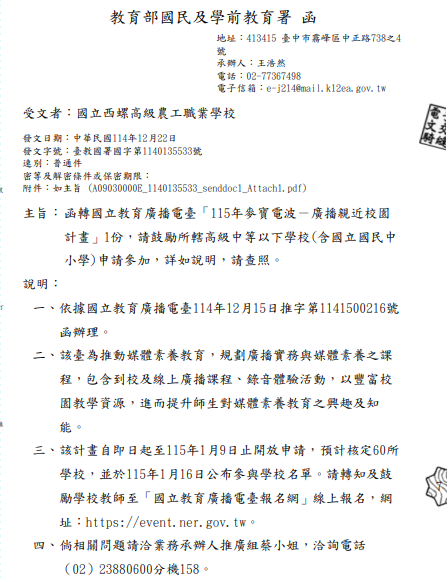【轉知】國立教育廣播電臺「115年麥寶電波-廣播親近校園計畫」1份國立教育廣播電臺115年麥寶電波廣播親近校園計畫下載 瀏覽次數: 7Post author:hlvs302aPost published:2025-12-23Post category:學生訊息Read more articles上一篇文章【轉知】靜宜大學台灣文學系於115年1月26~27日辦理「野放學╳ 創藝營」營隊電子海報下一篇文章【轉知】國立暨南國際大學第二十五屆水煙紗漣文學獎全國高中散文組、新詩組開始徵稿相關內容僑光科技大學財務金融系舉辦「金融投資理財營」,敬請惠予公告並鼓勵貴校學生踴躍報名參加2024-11-19國立臺灣師範大學辦理113年度「Cool English普技高英閱大師」活動辦法1份,鼓勵學生踴躍報名參加。2024-05-07