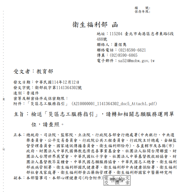 【轉知】衛生福利部檢送「災區志工服務指引」災區志工服務指引下載 瀏覽次數: 6Post author:hlvs302aPost published:2025-12-26Post category:學生訊息Read more articles上一篇文章【轉知】「教育部國民及學前教育署第8屆青少年諮詢會青少年代表遴選簡章」1份下一篇文章【轉知】搶救國文教育聯盟主辦及社團法人中華傳統文化儒釋道教育學會合辦「115年度第12屆全國高級中等學校古文背誦及古詩詞曲文吟唱比賽」實施計畫1份相關內容臺中市私立明道高級中學2025年5月24、25日辦理「拓凱新世紀青少年高峰論壇」活動2025-01-08景文科技大學應用外語系舉辦「2022年全國技專校院暨技術型高中職英語朗讀比賽」,請學生踴躍報名參加。2022-11-18