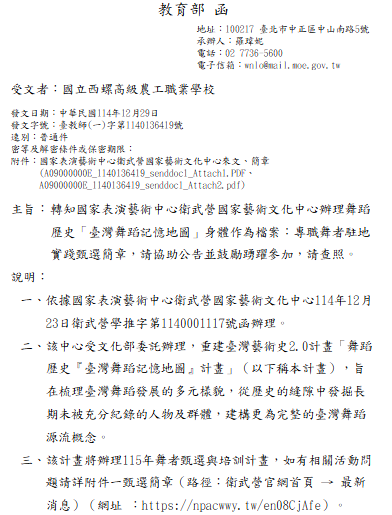 轉知-舞蹈歷史「臺灣舞蹈記憶地圖」身體作為檔案:專職舞者駐地實踐甄選簡章舞蹈歷史「臺灣舞蹈記憶地圖」身體作為檔案:專職舞者駐地實踐甄選簡章下載 瀏覽次數: 16Post author:hlvs203Post published:2025-12-30Post category:宣導資訊Read more articles上一篇文章115年寒假輔導課程(115年1月26至29日共計4日)合併學生專車路線,調整元發,台西及成吉三家客運公司各併成3線共9路線專車,請參加課輔同學依表訂時間提早5分鐘前往候車(如附檔)下一篇文章轉知-教育部中小學生成式AI之學習應用手冊《我和AI一起學》及《駕馭AI,洞察未來:數位公民的必修課》相關內容亞東學校財團法人亞東科技大學舉辦「2024說故事,寫故事–敘事好好玩」,請 貴校協助轉知同學踴躍報名參加2024-04-11雲林縣政府辦理本處113年度「第二十屆雲林文化藝術獎」2024-05-13