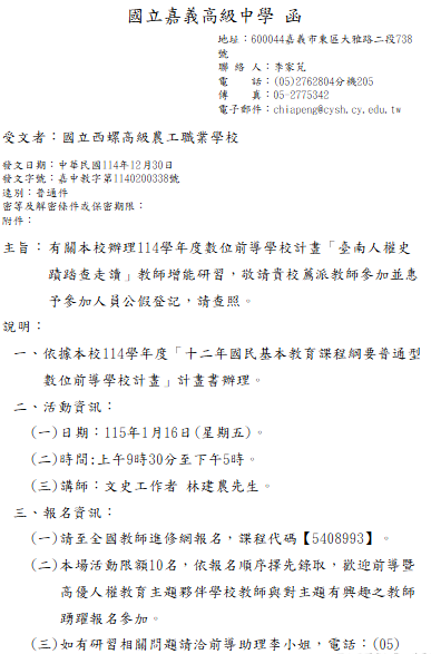 轉知-「臺南人權史蹟踏查走讀」教師增能研習 瀏覽次數: 10Post author:hlvs203Post published:2025-12-30Post category:研習活動Read more articles上一篇文章轉知-「從國小到高中都能用的探究課程模型:一堂課的完整誕生」研習活動相關內容文化部為提升各機關辦理文化藝術事務之著作權認知,特製「藝文事務著作權-創作保障藝起看」數位學習課程,歡迎師生參閱。2022-01-07教育部辦理「112年一般/專業種子師資增能回訓暨觀摩研習營」北區及中區場次,因受杜蘇芮颱風影響,課程延後辦理。2023-07-27