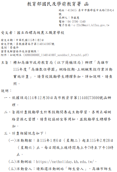 轉知-高雄市115年度「高雄數位學園」網路假期—上網飆寒假作業活動實施計畫高雄市115年度「高雄數位學園」網路假期—上網飆寒假作業活動實施計畫下載 瀏覽次數: 6Post author:hlvs203Post published:2026-01-02Post category:學生訊息Read more articles上一篇文章【轉知】國立勤益科技大學人工智慧應用工程系辦理「2026人工智慧與服務型機器人體驗營」相關內容轉佛光大學招生資訊2022-02-16就業服務e點通系統教育訓練2025-02-07