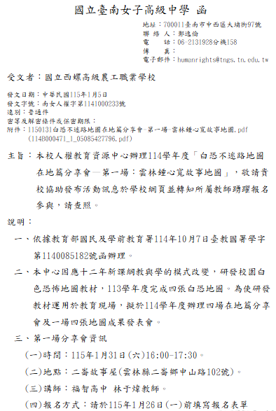 轉知-人權教育資源中心辦理114學年度「白恐不迷路地圖在地篇分享會—第一場:雲林鍾心寬故事地圖」報名網址:https://forms.gle/9finmzSn8WQPDuUU7白恐不迷路地圖在地篇分享會—第一場下載 瀏覽次數: 12Post author:hlvs203Post published:2026-01-05Post category:宣導資訊Read more articles上一篇文章轉知-教育部中小學生成式AI之學習應用手冊《我和AI一起學》及《駕馭AI,洞察未來:數位公民的必修課》相關內容教育部為宣導校園網路安全並協助教師與家長重視兒童上網安全重要性,推廣校園網安走唱團2023-11-08行政院性別平等處邀請參加「臺捷性別平等進程對話」線上論壇2021-08-03