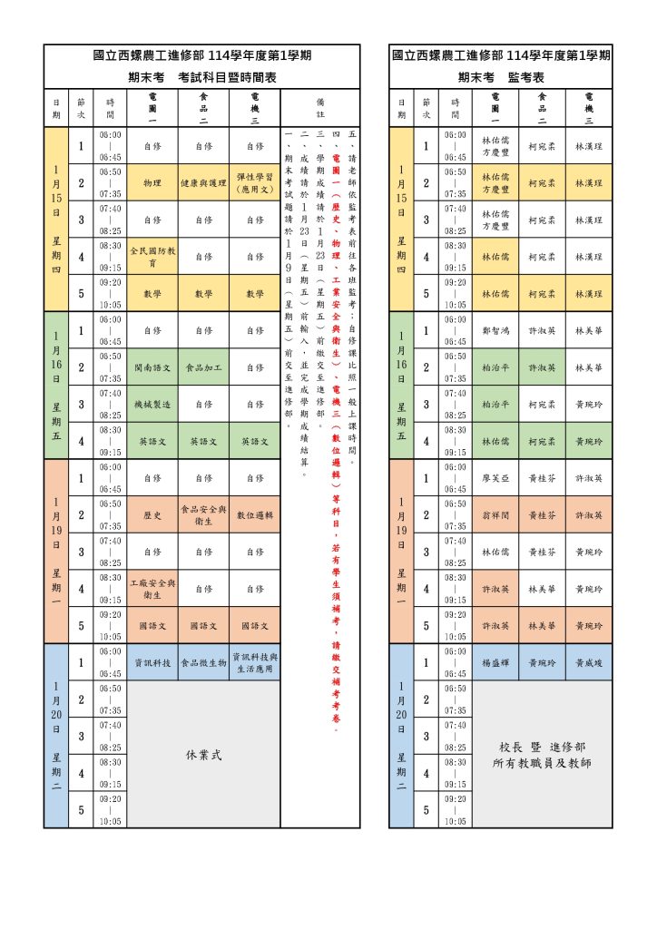 《進修部》114-1 期末考考試科目時間表一、試題請於1月9日(星期五)前交至進修部。二、各科學期成績請於1月23日(星期五)前輸入至北科大成績系統。三、請老師依監考表前往各班監考;自修課比照一般上課時間。四、因電圖一【歷史、物理、工業安全與衛生】、電機三【數位邏輯】為單學期科目, 預計於1月27日(星期二)下午2時辦理補考,請以上科目的任課教師,若有學 生須補考,務必於1月23日(星期五)前繳交補考考卷114-1 進修部期末考考程暨監考表 瀏覽次數: 104Post author:hlvs222Post published:2026-01-05Post category:-首頁公告 / 進修部(下載中心) / 重要公告Read more articles上一篇文章台南二中1月26日辦理數位學習精進方案-B4領域AI課程模組應用與分享,請全校踴躍參加hlvs222國立西螺高級農工職業學校進修部教務組長相關內容113年度身心障礙者職業訓練-婚禮小物設計暨造型手工皂培訓班2024-04-2410月29日、10月30日兩天為高三第2次學測模擬考,請高三仁社會學程認真準備。2025-10-29