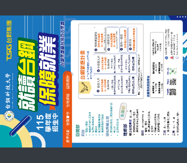 台鋼科技大學招生台鋼科技大學招生1下載 瀏覽次數: 83Post author:輔導室Post published:2026-01-06Post category:學生訊息 / 校園公告Read more articles上一篇文章國立嘉義大學農場管理進修學士學位學程農業公費專班招生下一篇文章國立臺南大學音樂學系「115學年度申請入學」招生相關內容彰化縣政府辦理「113年度N型特派員徵件活動」徵件辦法及主視覺海報電子檔各1份,轉知校內社團及組織,並鼓勵同學踴躍參加2024-04-22國立高雄師範大學111年3月12日(星期六)舉辦「2022入學最前線」招生說明會.2022-02-21