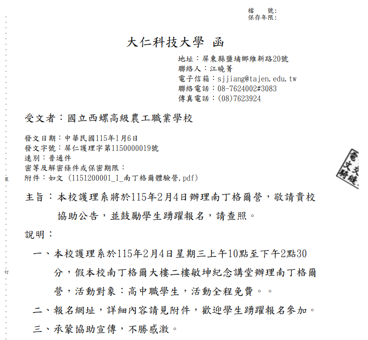 【轉知】大仁科技大學護理系將於115年2月4日辦理南丁格爾營1151200001_1_南丁格爾體驗營下載 瀏覽次數: 65Post author:hlvs302aPost published:2026-01-07Post category:學生訊息Read more articles上一篇文章【轉知】嘉藥學校財團法人嘉南藥理大學辦理「『幼』見美好心靈 : 115年幼保系暖心職人體驗日 」下一篇文章台灣電力股份有限公司115年新進僱用人員甄試相關內容【轉知】嘉藥學校財團法人嘉南藥理大學辦理「『幼』見美好心靈 : 115年幼保系暖心職人體驗日 」2026-01-07雲林縣政府為辦理111年補助公共圖書館提升民眾英語學習力計畫」,特別聘請專業師資教授英文文法、寫作及口說等課程。2022-06-20