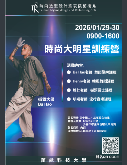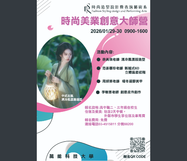 【轉知】萬能學校財團法人萬能科技大學辦理「時尚美業創意大師營」及「時尚大明星訓練營」萬能學校財團法人萬能科技大學-函下載 瀏覽次數: 10Post author:hlvs302aPost published:2026-01-08Post category:學生訊息Read more articles上一篇文章【轉知】世新大學辦理寒假高中營隊「AI 玩家養成計畫|氛圍協作開發體驗營」下一篇文章轉知-「來上客-12年國教客語文學習入口網站」全國競賽活動相關內容雲林縣政府辦理「媽祖文化藝術饗宴-藝韻繪影」藝術特展2024-03-27教育部國民及學前教育署「113年全國孝行獎 孝行楷模選拔 歡迎踴躍推薦」函及宣傳2024-02-19