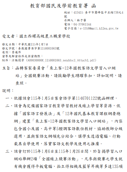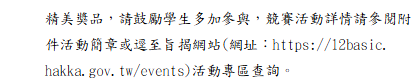 轉知-「來上客-12年國教客語文學習入口網站」全國競賽活動「來上客-12-年國教客語文學習入口網站」全國線上競賽活動活動簡章下載 瀏覽次數: 10Post author:hlvs203Post published:2026-01-08Post category:學生訊息Read more articles上一篇文章【轉知】萬能學校財團法人萬能科技大學辦理「時尚美業創意大師營」及「時尚大明星訓練營」下一篇文章轉知-國立臺灣師範大學辦理「2026年國際資訊奧林匹亞競賽選訓營」初選相關資訊相關內容國立勤益科技大學辦理112年「女性科學日學習營」活動流程及海報電子檔各乙份2023-10-17國立陽明交通大學新思科技X陽明交大臺灣半導體IC營」暑期營隊活動2025-04-08