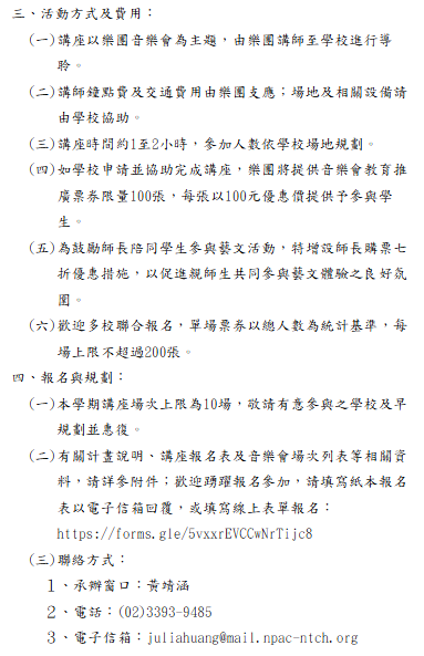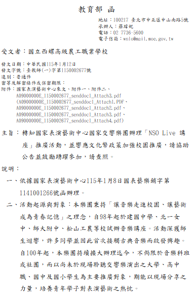 轉知-國家表演藝術中心國家交響樂團辦理「NSO Live 講座」推廣活動「NSO-Live-講座」推廣活動_Attach1下載「NSO-Live-講座」推廣活動_Attach2下載「NSO-Live-講座」推廣活動_Attach3下載「NSO-Live-講座」推廣活動_Attach4下載 瀏覽次數: 7Post author:hlvs203Post published:2026-01-12Post category:宣導資訊Read more articles上一篇文章115學年度運動績優生招生簡章及規定相關內容臺中市私立明道高級中學2025年5月24、25日辦理「拓凱新世紀青少年高峰論壇」活動2025-01-08財團法人中華民國兒童福利聯盟文教基金會辦理「兒福聯盟暑假營隊」2024-05-22
