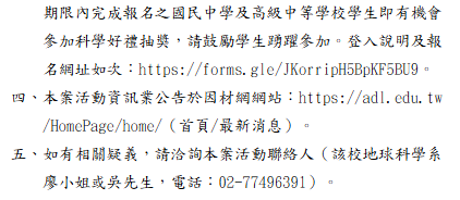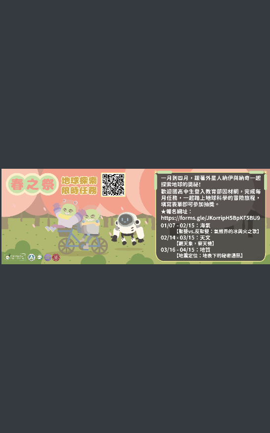 轉知-教育部2026年因材網地球科學跨校學習活動「春之祭——地球探索限時任務」活動資訊「春之祭——地球探索限時任務」_Attach1-1下載「春之祭——地球探索限時任務」_Attach2-1下載「春之祭——地球探索限時任務」_Attach3-1下載 瀏覽次數: 5Post author:hlvs203Post published:2026-01-13Post category:學生訊息Read more articles上一篇文章【轉知】臺北醫學大學【Coursera Pro空中飛行研習課程】相關內容國立臺北科技大學進修部推廣教育中心辦理高中職-大學先修-「科技寫作課程」、「APCS檢測進階-資料結構設計與方法(C/C++)實作課程」、「APCS檢測-初階-程式設計與語言結構(C/C++)基礎課程」,歡迎學生踴躍參加2021-12-13國立臺南藝術大學音樂學系辦理「管弦樂團音樂會-三重協奏曲之夜」音樂會2025-04-22