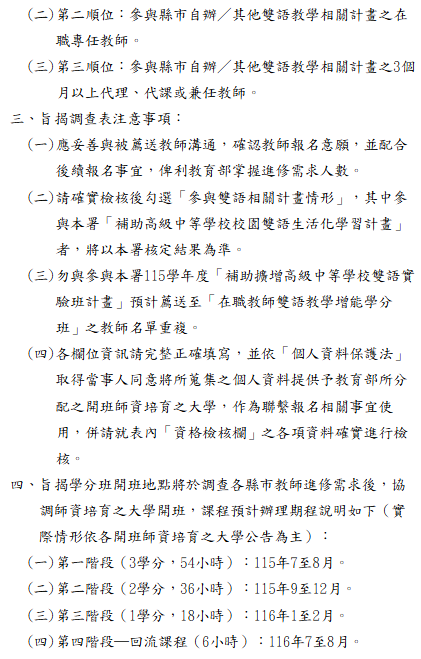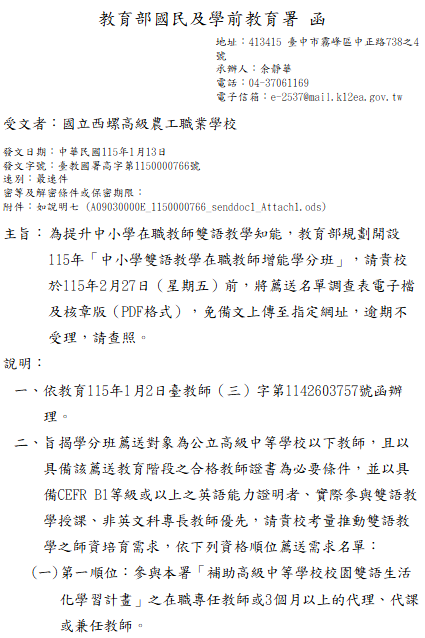 轉知-有關教育部規劃開設115年「中小學雙語教學在職教師增能學分班」事宜 瀏覽次數: 6Post author:hlvs203Post published:2026-01-13Post category:教職員公告Read more articles上一篇文章公告-公教人員保險生育給付差額補助要點自115年1月1日生效。下一篇文章轉知-檢送大陸委員會製作之「適用公務員服務法人員赴陸港澳規範告知書」1份。相關內容國立公共資訊圖書館「2025 從靈感到經典—原創兒童文學 x 繪本創作論壇」實施計畫(如附件1),請踴躍報名參加2025-04-29轉知「臺北市114學年度市立高級中等學校校長出缺學校新任校長遴選作業簡章」1份2025-06-04