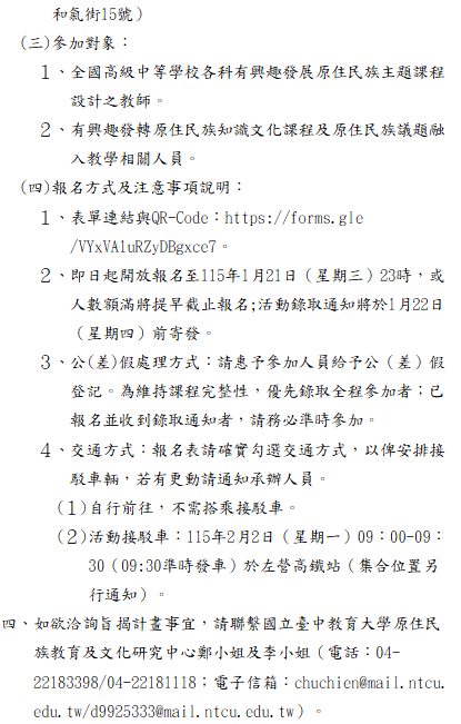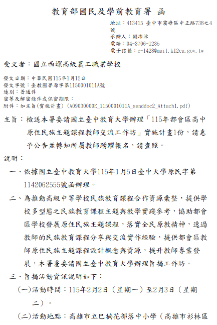 轉知-國立臺中教育大學辦理「115年都會區高中原住民族主題課程教師交流工作坊」教育部國民及學前教育署115-年都會區高中原住民族主題課程教師交流工作坊實施計畫下載 瀏覽次數: 4Post author:hlvs203Post published:2026-01-13Post category:研習活動Read more articles上一篇文章轉知-高雄市立海青高級工商職業學校辦理「用Google Gemini玩轉Vibe Coding教學實作」教師研習下一篇文章轉知-財團法人二二八事件紀念基金會辦理「2026年二二八人權教師研習營」相關內容國立高雄科技大學商業智慧學院觀光管理系舉辦「2022高科盃-日語導覽競賽」,鼓勵本校師生踴躍組隊報名參加。2022-08-23愛滋病防治宣導研習活動2025-03-06