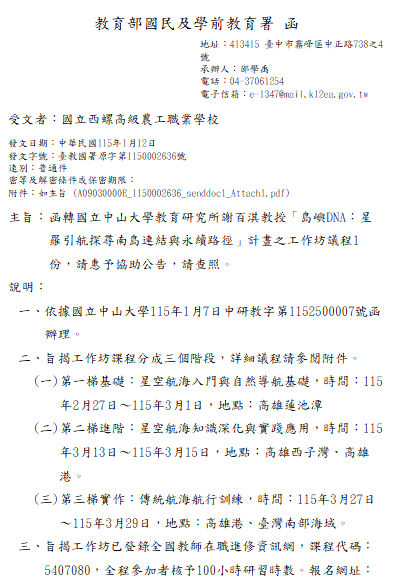 轉知-「島嶼DNA:星羅引航探尋南島連結與永續路徑」計畫之工作坊議程2026年第二屆《星空航海種子教師增能工作坊》初階課程_Attach1下載 瀏覽次數: 4Post author:hlvs203Post published:2026-01-13Post category:研習活動Read more articles上一篇文章轉知-財團法人二二八事件紀念基金會辦理「2026年二二八人權教師研習營」相關內容特教研習-大專院校自閉症學生之輔導與支持策略研討會2024-04-16公民與社會學科中心與桃園課程發展與精緻教學中心、新竹市課程與教學發展中心、高雄市教育局十二年國教發展團隊合作辦理「設計思考工作坊—公共議題探究與實作課程設計」,敬邀本校教師參加。2022-11-07