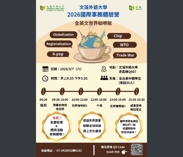 【轉知】文藻學校財團法人文藻外語大學國際事務系舉辦「2026國際事務體驗營–全英文世界咖啡館」文藻學校財團法人文藻外語大學-函下載 瀏覽次數: 7Post author:hlvs302aPost published:2026-01-22Post category:學生訊息Read more articles上一篇文章【轉知】國立政治大學舉辦「2026全國學生政大運動文學獎」下一篇文章【轉知】教育部青年發展署「115年青年壯遊臺灣─尋找感動地圖實踐計畫」自即日起至115年3月13日受理報名申請相關內容【轉知】教育部青年發展署「115年青年壯遊臺灣─尋找感動地圖實踐計畫」自即日起至115年3月13日受理報名申請2026-01-22【轉知】南大經管營-智慧驅動管理,創新商業模式2025-10-20
