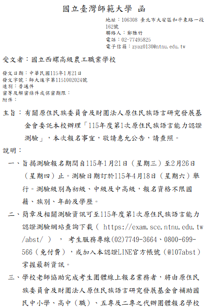 轉知-「115年度第1次原住民族語言能力認證測驗」 瀏覽次數: 10Post author:hlvs203Post published:2026-01-22Post category:宣導資訊Read more articles上一篇文章轉知-國立彰化師範大學進修學院推廣教育「【2026國高中程式語言】Certiport ITS Python程式設計班」、「日語會話五十音基礎班」、「日語N3中級II班」招生簡章相關內容【轉知】輔仁大學學校財團法人輔仁大學推廣教育中心辦理「2026 冬令營—藝術小實驗室:聽見、看見、動起來」課程2025-12-11雲林縣政府檢送「全國學生音樂比賽決賽團體項目及個人項目辦理順 序互調(草案)雲林縣意見收集表」1份2024-09-20