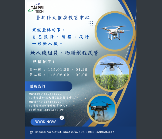 【轉知】國立臺北科技大學預定於115年01月26日(第一梯)及115年02月02日(第二梯)起開辦【無人機組裝、物聯網程式營】課程國立臺北科技大學-函下載 瀏覽次數: 6Post author:hlvs302aPost published:2026-01-28Post category:學生訊息Read more articles上一篇文章【轉知】內政部「115年全國孝行獎活動實施計畫」下一篇文章【轉知】國立臺北科技大學預定於115年01月26日(第一梯)及115年02月02日(第二梯)起開辦【無人機組裝、物聯網程式營】課程相關內容國教署「性別平等教育資源中心」及「校園性別事件防治資源中心」網站整併至「友善校園學生事務與輔導工作資訊網」之網址變更如說明2023-09-174/8-4/9辦理高三統測第五次模擬考,請高三同學認真準備2025-03-20