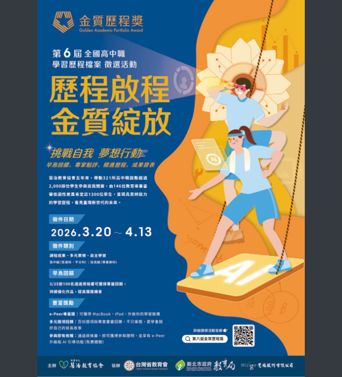 第六屆【金質歷程獎】全國高中職學習歷程檔案徵選活動臺灣省教育會-函-1下載活動簡章-2下載宣傳單下載 瀏覽次數: 7Post author:hlvs202aPost published:2026-01-28Post category:學生訊息 / 教職員公告Read more articles上一篇文章財團法人台灣兒童暨家庭扶助基金會114學年度第2學期期「韌世代獎助學金」相關內容公告-檢送行政院人事行政總處114年12月修訂之「國民旅遊卡相關事項Q&A」及修正說明各1份。2025-12-24社團法人中華安得烈慈善協會辦理「第八屆學藝競賽」活動。2023-03-09