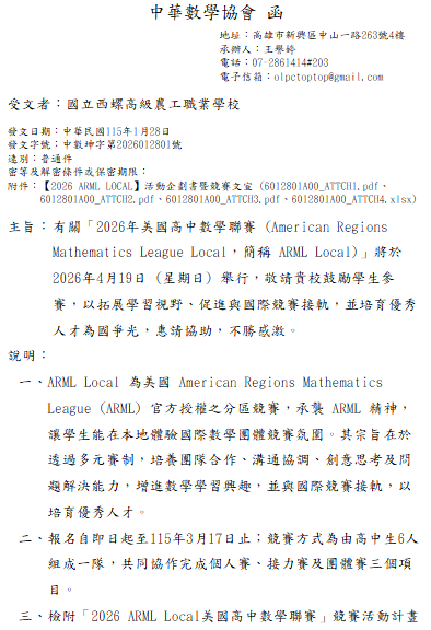 轉知-2026年美國高中數學聯賽2026年美國高中數學聯賽_ATTCH1下載2026年美國高中數學聯賽_ATTCH2下載2026年美國高中數學聯賽_ATTCH3下載2026年美國高中數學聯賽_ATTCH4下載 瀏覽次數: 9Post author:hlvs203Post published:2026-01-29Post category:學生訊息Read more articles上一篇文章轉知:「2026年全國學生圖畫書創作獎」徵選簡章及相關書表各1份,請學生踴躍參與徵選下一篇文章轉知-輔英科技大學全國自主學習(SDL)成果簡報競賽相關內容財團法人溫世仁文教基金會辦理「112年中小學作文比賽」活動,請踴躍報名參加。2023-01-04國立臺北大學辦理「寒假日語發音基礎密集班」課程,鼓勵師生、同仁踴躍參加。2022-12-20