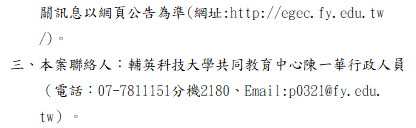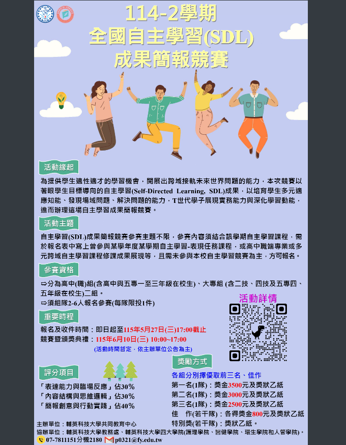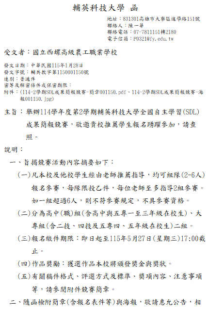 轉知-輔英科技大學全國自主學習(SDL)成果簡報競賽114-2學期SDL成果簡報競賽-簡章001150下載 瀏覽次數: 10Post author:hlvs203Post published:2026-01-29Post category:學生訊息Read more articles上一篇文章轉知-2026年美國高中數學聯賽下一篇文章【轉知】淡江大學學校財團法人淡江大學115年2月27日(星期五)「2026高中營—淡水未上映」活動簡章及海報相關內容國立雲林科技大學應用外語系辦理「2022 英雲盃全國技專院校暨高中職英文Podcast競賽」辦法、比賽報名表及著作財產權授權使用同意書各1份,請師生踴躍報名參加。2022-06-01111-1多元選修、彈性學習選課通知2022-06-13
