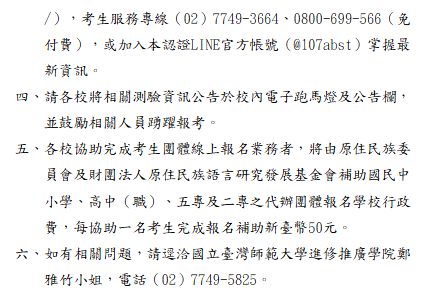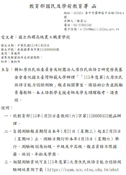 轉知-「115年度第1次原住民族語言能力認證測驗」報名相關事宜 瀏覽次數: 7Post author:hlvs203Post published:2026-01-29Post category:宣導資訊Read more articles上一篇文章【轉知】國立臺灣師範大學辦理114年教育部品德教育資源網徵稿活動入選作品資訊相關內容教育部修訂「校園災害防救計畫(示例)」及「家庭防災卡」一案2023-02-17全國逆境少年家庭支持服務研討會,歡迎有興趣教師報名參。2024-10-07