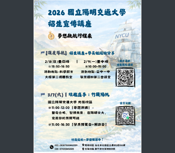 國立陽明交通大學2026年招生宣傳講座國立陽明交通大學2026年招生宣傳講座1下載國立陽明交通大學2026年招生宣傳講座2下載 瀏覽次數: 7Post author:輔導室Post published:2026-01-31Post category:學生訊息 / 校園公告Read more articles上一篇文章【轉知】教育部國民及學前教育署「第8屆高級中等學校學生代表與署長有約活動實施計畫」下一篇文章國立東華大學法律學系原住民專班學士班單獨招生說明會相關內容110年6月畢業生及修退轉學生「專車車資及重補修」退費公告2022-02-24遠東科技大學本校辦理「HADO WORLD CUP 2023台灣區選拔賽」競賽訊息2023-05-17