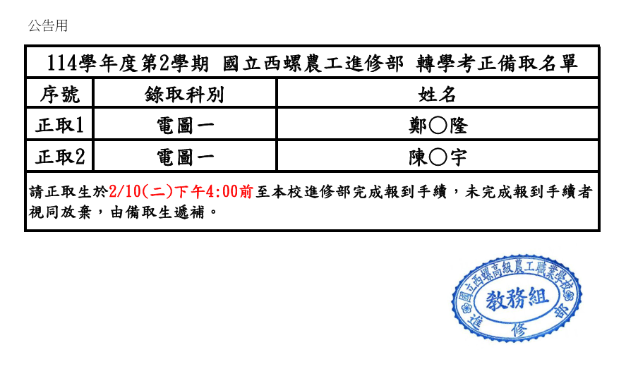【進修部】公告114學年度第2學期轉學考錄取名單 瀏覽次數: 70Post author:hlvs222Post published:2026-02-02Post category:-首頁公告 / 進修部(下載中心) / 重要公告Read more articles上一篇文章第1150313梯次全國高級中等學校小論文寫作比賽開始報名,請踴躍參加下一篇文章新書上架啦 各位讀者 看過來~看過來~,歡迎蒞館參觀借閱。hlvs222國立西螺高級農工職業學校進修部教務組長相關內容國立臺北科技大學與南臺科技大學合作辦理113年「永續能源探索營職能深化課程」資訊2024-05-27台南家專學校財團法人台南應用科技大學辦理「台江逐鹿記–呦呦鹿鳴」系列活動2024-05-01