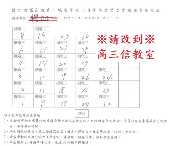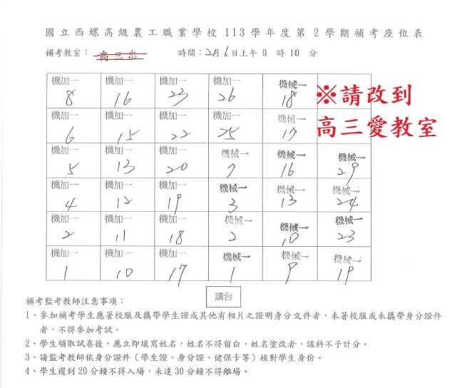 機加一教室改到高三信教室(就讀機電三的補考學生) 高三忠教室改到高三愛考試(就讀機加一和機械一的補考學生)