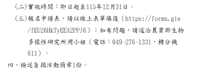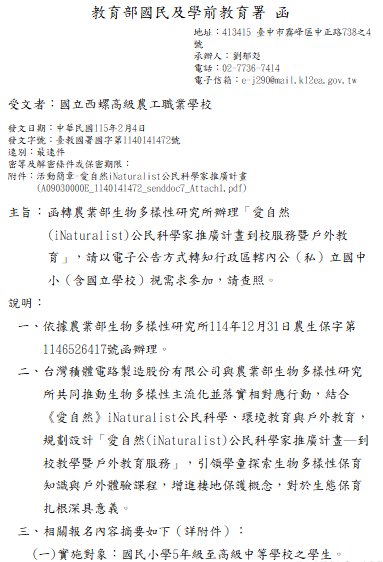 轉知-農業部生物多樣性研究所辦理「愛自然(iNaturalist)公民科學家推廣計畫到校服務暨戶外教育」愛自然iNaturalist公民科學家推廣計畫到校服務暨戶外教育活動簡章下載 瀏覽次數: 5Post author:hlvs203Post published:2026-02-04Post category:學生訊息Read more articles上一篇文章【轉知】嶺東科技大學辦理 2026「千人動漫畫臺灣」全國高中職學生原創漫畫與插畫競賽簡章相關內容國立海洋科技博物館鼓勵偏遠弱勢族群到館參訪教學活動,特辦理「2025學海無涯」補助計畫,歡迎符合資格之學校或單位踴躍報名參與2025-02-21東南科技大學辦理暑期研習營計畫之「虛擬主播VTuber研習營」、「動漫研習營」2023-07-03