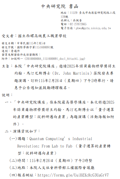 轉知-「中央研究院講座」邀請2025年諾貝爾物理學獎得主約翰.馬汀尼斯博士(Dr. John Martinis)蒞院發表專題演講 瀏覽次數: 4Post author:hlvs203Post published:2026-02-05Post category:宣導資訊Read more articles上一篇文章教育部委託製作之「海外留遊學消費權益維護」手冊,請廣為運用相關內容轉知臺南市政府教育局辦理「2024台灣燈會在臺南-全國花燈競賽」收件注意事項2024-02-17東南科技大學表演藝術系舉辦「2024東南表藝極限探索營」文化研習營」比賽2024-05-17