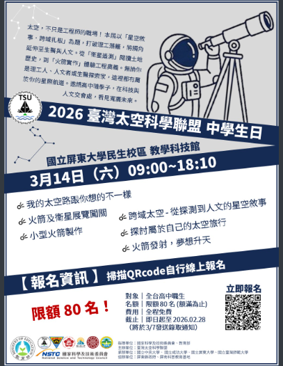 【轉知】國立中央大學臺灣太空科學聯盟謹訂於本(115)年3月14日(星期六)09:00~18:10,於國立屏東大學民生校區教學科技館舉辦「2026臺灣太空科學聯盟中學生日」活動國立中央大學-函下載2026-臺灣太空科學聯盟-中學生日下載 瀏覽次數: 6Post author:hlvs302aPost published:2026-02-12Post category:學生訊息Read more articles上一篇文章【轉知】「中原大學服務學習季刊-115年2月號」線上閱覽資訊下一篇文章【轉知】中央研究院參與「臺灣橋梁計畫」(TAIWAN BRIDGES)邀請諾貝爾獎得主葛瑞格利.溫特(Gregory P. Winter)博士爵士蒞院發表專題演講相關內容國立雲林科技大學產業科技學士學位學程之線上招生說明會2022-07-25國立西螺農工112學年度畢業班生活照/團體照拍攝時間表2023-10-27