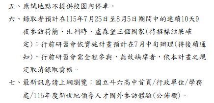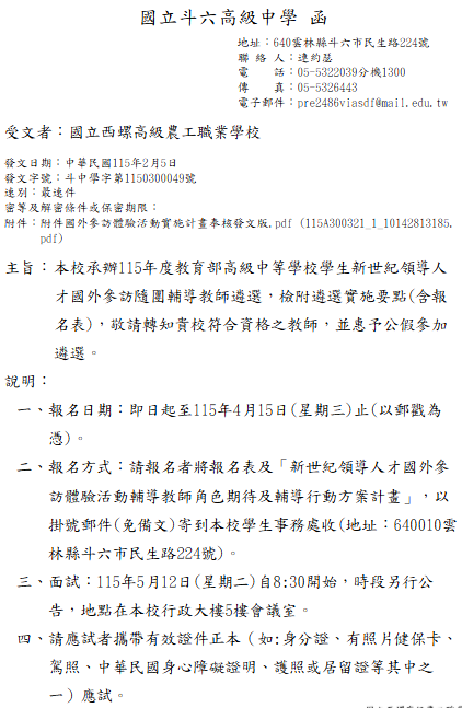 轉知-115年度教育部高級中等學校學生新世紀領導人才國外參訪隨團輔導教師遴選115-年度教育部高級中等學校學生新世紀領導人才國外參訪體驗活動_附件下載 瀏覽次數: 6Post author:hlvs203Post published:2026-02-12Post category:教職員公告Read more articles上一篇文章轉知-國際教育交流聯盟第四區辦事處協助辦理「115年選送中小學國際教育教師出國入班觀課計畫」線上說明會下一篇文章公告-有關退休教職員經審定支(兼)領月退休金再任政府機關編列預算支給薪酬職務,得否自願減少支領薪酬總額,以繼續支領(兼)月退休金疑義。相關內容轉知有關-衛生福利部召開「兒童及少年性剝削防制諮詢會第3屆第2次會議」決議事項2022-04-14教育部委請臺北市立大學辦理「114年度中小學教師專業學習社群召集人講師增能培訓課程」及「114年度中小學教師專業學習社群召集人講師培訓課程」增辦場次資訊。2025-07-25