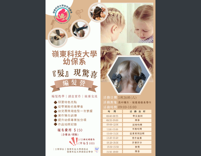 【轉知】嶺東科技大學幼兒保育系辦理「髮現驚喜編髮營」活動企劃書嶺東科技大學-函-1下載1150000161_嶺東幼保系編髮活動企劃書1150112下載下載-5下載 瀏覽次數: 2Post author:hlvs302aPost published:2026-02-12Post category:學生訊息Read more articles上一篇文章【轉知】陸軍專科學校舉辦年度「勇士專案」活動相關內容國立臺南藝術大學音樂學系辦理「管弦樂團音樂會-三重協奏曲之夜」音樂會2025-04-22聯合數位文創股份有限公司於113年7月4日~113年10月13日於中正紀念堂1展廳舉辦《怪獸與大自然的奇幻世界》特展,規劃有專人導覽服務。2024-08-13