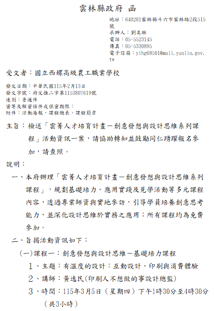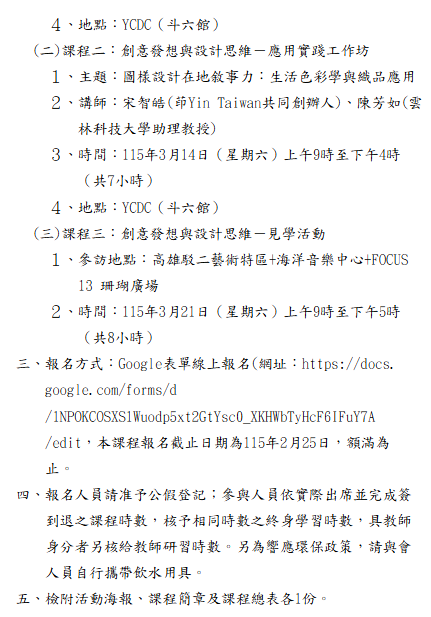 轉知-「雲菁人才培育計畫-創意發想與設計思維系列課程」活動資訊 瀏覽次數: 4Post author:hlvs203Post published:2026-02-13Post category:研習活動Read more articles上一篇文章轉知: 國家人權博物館「115年人權故事車-全國校園巡迴活動」下一篇文章轉知-FICHET臺灣華語教育資源中心辦理「華語教學系列講座」相關內容教育部委託本校辦理「111年至112年美感與設計課程創新計畫─中區美感教育大學基地學校計畫」111學年度第二學期到校美感體驗課程申請計畫及意願表1份(詳附件),轉本校所屬教師2023-02-13國立臺南第二高級中學資訊科技學科中心辦理「110學年度媒體素養教材編撰產出工作坊」,歡迎同仁踴躍參加。2022-06-15