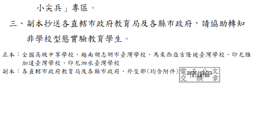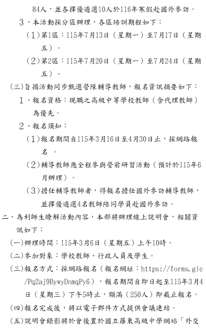 轉知-「115年度外交小尖兵世界領航營」相關事宜 瀏覽次數: 20Post author:hlvs203Post published:2026-02-23Post category:宣導資訊Read more articles上一篇文章【公告】身心障礙者權利公約第三次國家報告條約專要文件相關內容轉知-115年度第四屆海洋保育貢獻楷模獎選拔作業2026-01-08轉知國立彰化師範大學地理學系辦理地理營活動2022-12-27