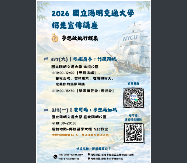 國立陽明交通大學2026 年招生宣傳講座國立陽明交通大學2026-年招生宣傳講座1下載 瀏覽次數: 66Post author:輔導室Post published:2026-02-24Post category:學生訊息 / 校園公告Read more articles上一篇文章國立臺灣藝術大學115學年度進修學士班考試招生訊息下一篇文章【轉知】長庚學校財團法人長庚科技大學辦理「2026全國在臺留學境外生短片創作競賽高中職組」相關內容景文科技大學辦理領團學習2023-04-10國立臺灣師範大學辦理「112年度『Cool English 普技高自主學習』活動獎勵辦法」1份,鼓勵學生踴躍報名參加。2023-01-19