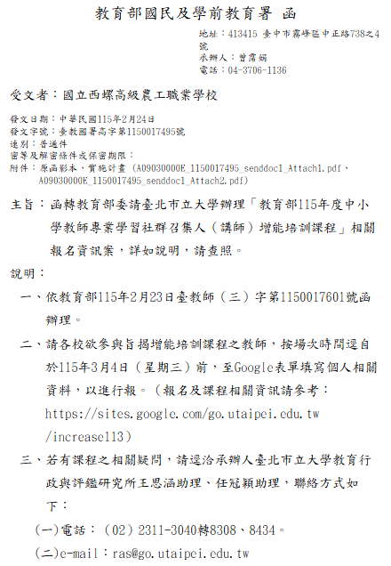 請欲參與旨揭增能培訓課程之教師,按場次時間逕自於115年3月4日(星期三)前,至Google表單填寫個人相關資料,以進行報。(報名及課程相關資訊請參考:https://sites.google.com/go.utaipei.edu.tw/increase113)