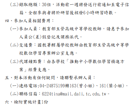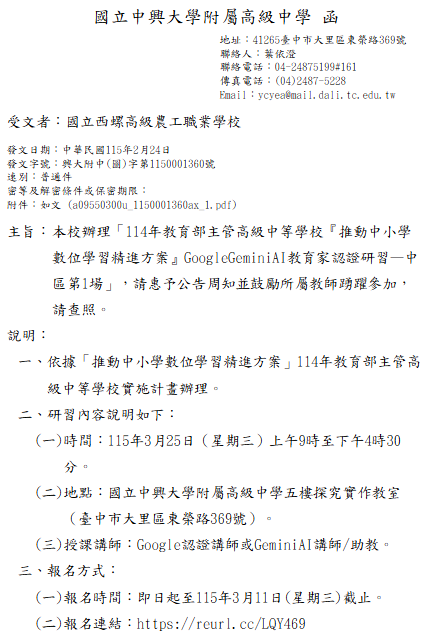 轉知-114年教育部主管高級中等學校『推動中小學數位學習精進方案』GoogleGeminiAI教育家認證研習—中區第1場(一)報名時間:即日起至115年3月11日(星期三)截止。(二)報名連結:https://reurl.cc/LQY4Google-Gemini-AI-教育家認證研習_1下載 瀏覽次數: 3Post author:hlvs203Post published:2026-02-25Post category:研習活動Read more articles上一篇文章轉知-教育部115年度中小學教師專業學習社群召集人(講師)增能培訓課程相關內容國立臺中教育大學辦理112年10-11月「原住民族教育師資修習原住民族文化及多元文化教育課程」實體研習場次報名資訊。2023-09-13國立臺南大學「112年高級中等學校閩客暨閩東語文教學支援工作人員培訓認證計畫回流課程實施計畫」,鼓勵教師報名參加。2023-09-19
