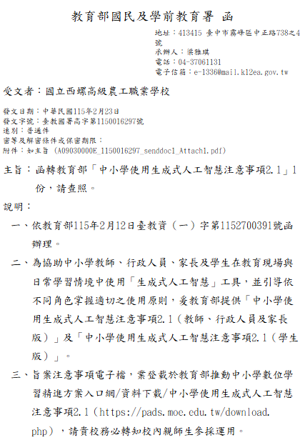 轉知-教育部「中小學使用生成式人工智慧注意事項2.1」中小學使用「生成式人工智慧」注意事項2.1下載 瀏覽次數: 7Post author:hlvs203Post published:2026-02-25Post category:宣導資訊 / 教職員公告Read more articles上一篇文章轉知-臺北市立大學辦理「2026Best Education-KDP全國學校經營與教學創新KDP國際認證獎」活動相關資訊及簡章下一篇文章轉知-全國「114學年度協作共好計畫自主學習分享會」相關內容國立西螺農工職校110學年度第1學期第2次段考試科目時間表 (1119版)修正版2021-11-19轉知「110年性平觀察家養成挑戰有獎徵答」社會組個人、機關組團體競賽活動辦法,請踴躍參與。2021-12-17
