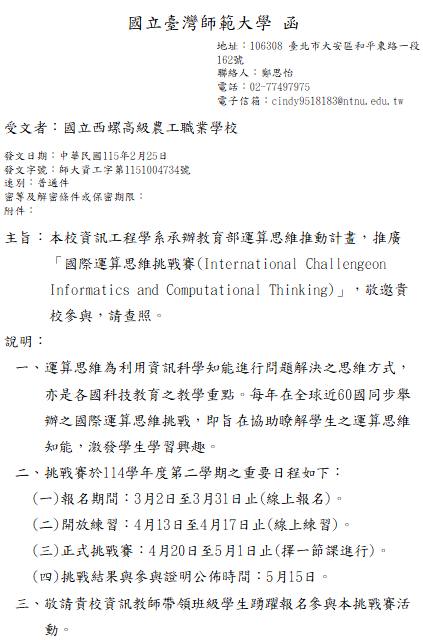 轉知-教育部運算思維推動計畫「國際運算思維挑戰賽」詳細資訊請參考官網 https://bebras.csie.ntnu.edu.tw,或電洽02-77497975。 瀏覽次數: 4Post author:hlvs203Post published:2026-02-26Post category:宣導資訊 / 教職員公告Read more articles上一篇文章轉知-「115年度十二課綱原住民族教育議題融入校訂課程推廣計畫」教師自主學習社群方案徵件下一篇文章轉知-2026年「外語能力測驗」(FLPT)與「外語能力測驗-歐日語基礎級」(FLPT-Basic)報名資訊相關內容110-2綜高一升二學程分流名單公告2022-06-16教育部「中小學數位教學指引1.0版」1份,請參採運用。2022-10-12