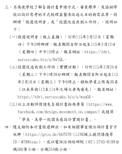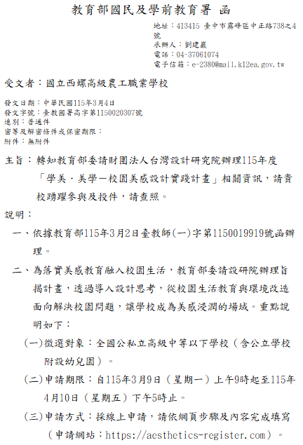轉知-教育部委請財團法人台灣設計研究院辦理115年度「學美.美學-校園美感設計實踐計畫」 瀏覽次數: 33Post author:hlvs203Post published:2026-03-04Post category:宣導資訊Read more articles上一篇文章轉知-臺南女中人權教育資源中心與高雄市立歷史博物館合作辦理114學年度「白恐不迷路在地篇」成果發表會下一篇文章轉知「季節性流感防治工作手冊(115年2月修訂版)」已公布於衛生福利部疾病管制署全球資訊網,請逕自上網瀏覽及下載參考應用。相關內容臺中市政府教育局協同本校合辦2025「千人動漫畫臺中」全國高中職學生原創漫畫競賽,敬請惠予公告並鼓勵貴校學生踴躍參加競賽2025-02-20國立空中大學嘉義學習指導中心雲林服務處112學年下學期招生訊息2023-11-21