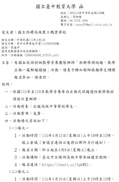 (一)場次一1、活動時間:115年4月12日(星期日)上午10時至12時,線上會議(會議室連結日後將以郵件另行通知)。2、報名日期:即日起至4月8日(星期三)截止。3、活動講師:臺北市立陽明高級中學吳林建宏教師。4、報名連結:https://reurl.cc/lpkWEl。