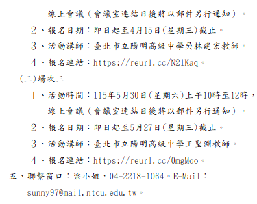 (三)場次三1、活動時間:115年5月30日(星期六)上午10時至12時,線上會議(會議室連結日後將以郵件另行通知)。2、報名日期:即日起至5月27日(星期三)截止。3、活動講師:臺北市立陽明高級中學王聖淵教師。4、報名連結:https://reurl.cc/0mgM